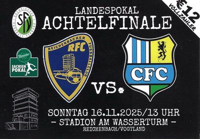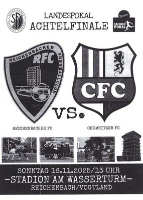 16/11/25, 13:00 Uhr (MEZ) Sachsenpokal 2025/26 - Achtelfinale Reichenbacher FC - Chemnitzer FC 0:6 Zuschauer: 1.800 (Kapazität: 5.000) |