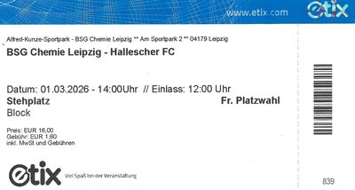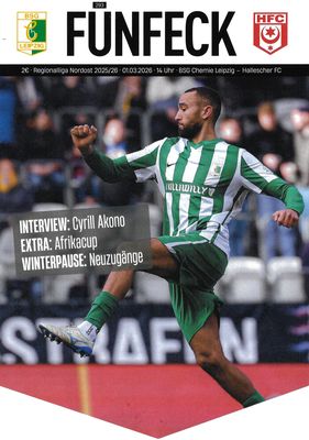 01/03/26, 14:00 Uhr (MEZ) Regionalliga Nordost 2025/26 - 24.Spieltag BSG Chemie Leipzig - Hallescher FC 0:2 Zuschauer: 4.999 (ausverkauft) |